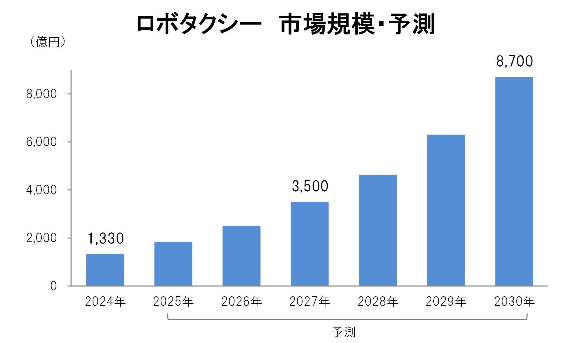 世界市場規模は 2024 年の 1,330 億円から年平均 36.4%で成長し、2030 年には 8,700 億円、保有車両数は 10 万台に達する見通しです。今後は中東や欧州での展開拡大、政府支援や技術革新、サービス多様化により、市場が拡大し、車両の量産化などにより参入企業の収益力向上が期待されています。