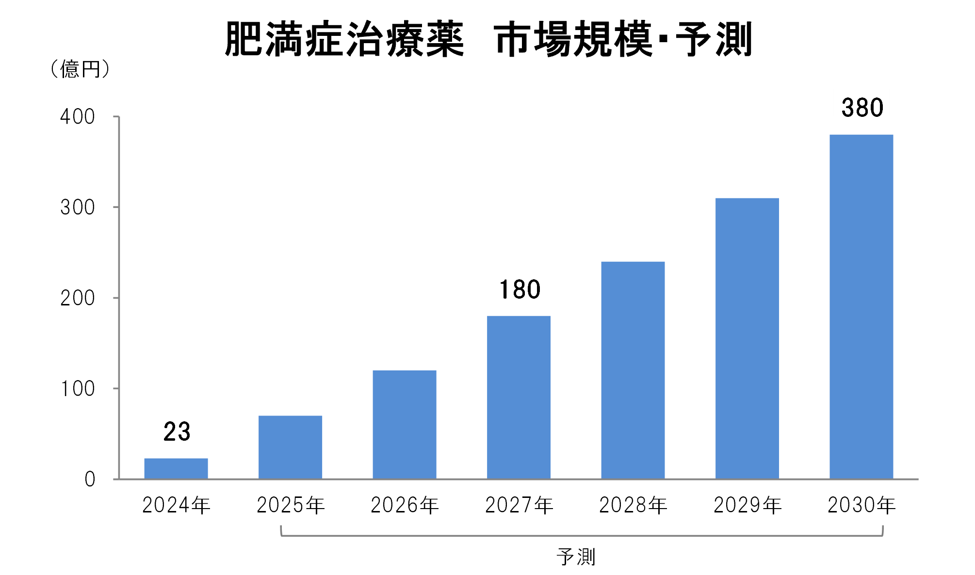 肥満症治療薬市場は、従来の「食欲抑制薬中心の市場」から、インクレチン作用を活用した「バイオ医薬品による肥満症治療」へと市場構造が大きく転換しています。市場規模は、厚生労働省が示す最適使用推進ガイドラインに基づく適正使用を前提として、2024年の23億円から、2030年には380億円まで成長すると予測しています。