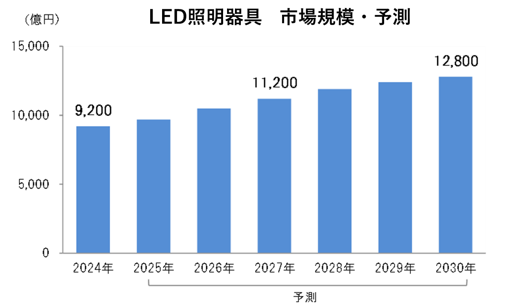一方、2024年末時点で既設照明のLED化率は約60%、屋外の非住宅では約70%に達していますが、築年数の古い住宅、中小工場・オフィスなどでは施工人員の不足が普及の障害となる懸念があり、メーカーは施工性を高めた新製品の投入を進めています。また、センサやカメラなどとIoT/AIを連携させたLEDのスマート照明がオフィス、工場、医療福祉施設などで拡大し、住宅向けでも調光・調色に加え、くつろぎの演出や除菌機能を加えた製品が注目されています。LED照明器具の市場規模は、2024年の9,200億円から、2030年には1兆2,800億円まで成長すると予測しています。
