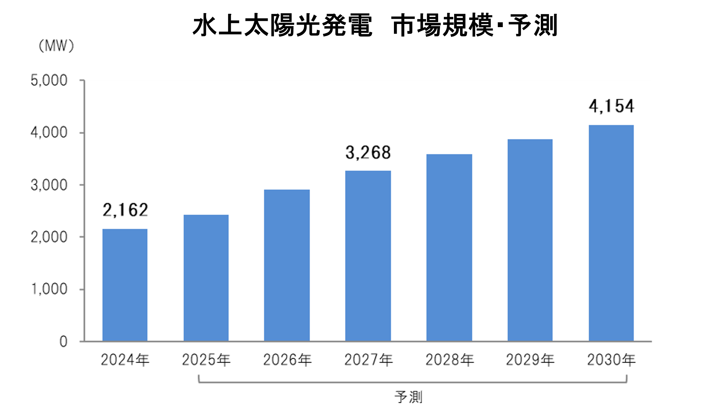 市場では、水生生物や鳥類などの生態系への影響評価や水上特有の運用管理の効率化などの課題はありますが、内陸水面に加え洋上での実用化も進みつつあり、技術進展を通じて新たな再生可能エネルギー分野として今後も成長が期待できます。世界の市場規模は、2024年の2,162MWから、2030年には4,154MWまで拡大すると予測しています。