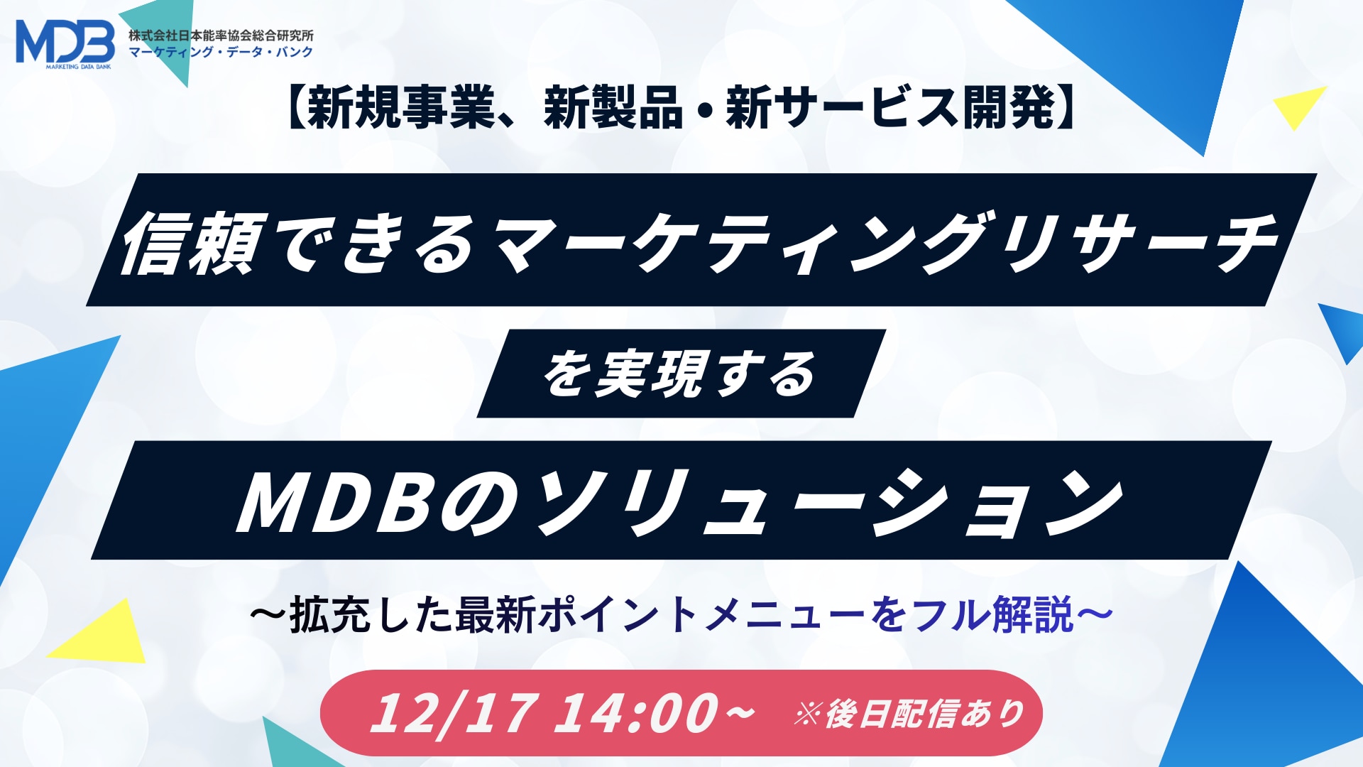本セミナーでは、世界中の公開情報をワンストップで収集できるMDBの主要ソリューションを活用し、事業構想・商品企画の精度を高めるためのマーケティングリサーチ手法 を体系的にご紹介します。