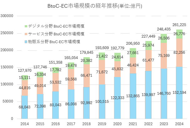 2024年のBtoC-EC市場規模は26兆1,225億円となり、前年から1兆2,790億円の増加となりました。