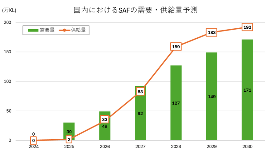 政府諮問会議「GX実行会議」の下で2024年12月に経済産業省GXグループGX投資促進課などが策定した分野別投資戦略の中で、SAFの国内市場規模は2025年の需要ベースで30万キロリットルと推計されています。2030年には同171万キロリットルまで拡大すると予測され、これは国内のジェット燃料使用量の10%にあたります。