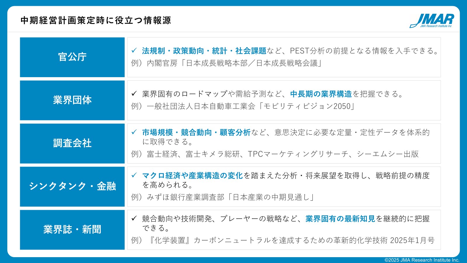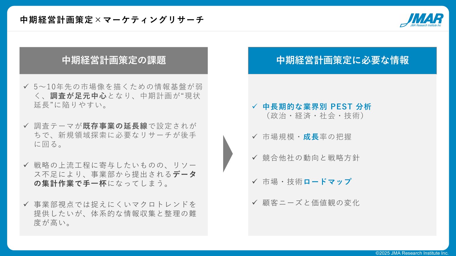 中期経営計画は、未来を見据えた成長の道筋を示す計画です。しかし実務では、未来予測やさまざまな業界の調査をすることが難しく、AIやWeb検索だけでは必要な情報が揃わないこともあります。官公庁、業界団体、調査会社、シンクタンク、業界誌に情報源を限定しても、時間と労力がかかり、計画が進まないことが多く見受けられます。